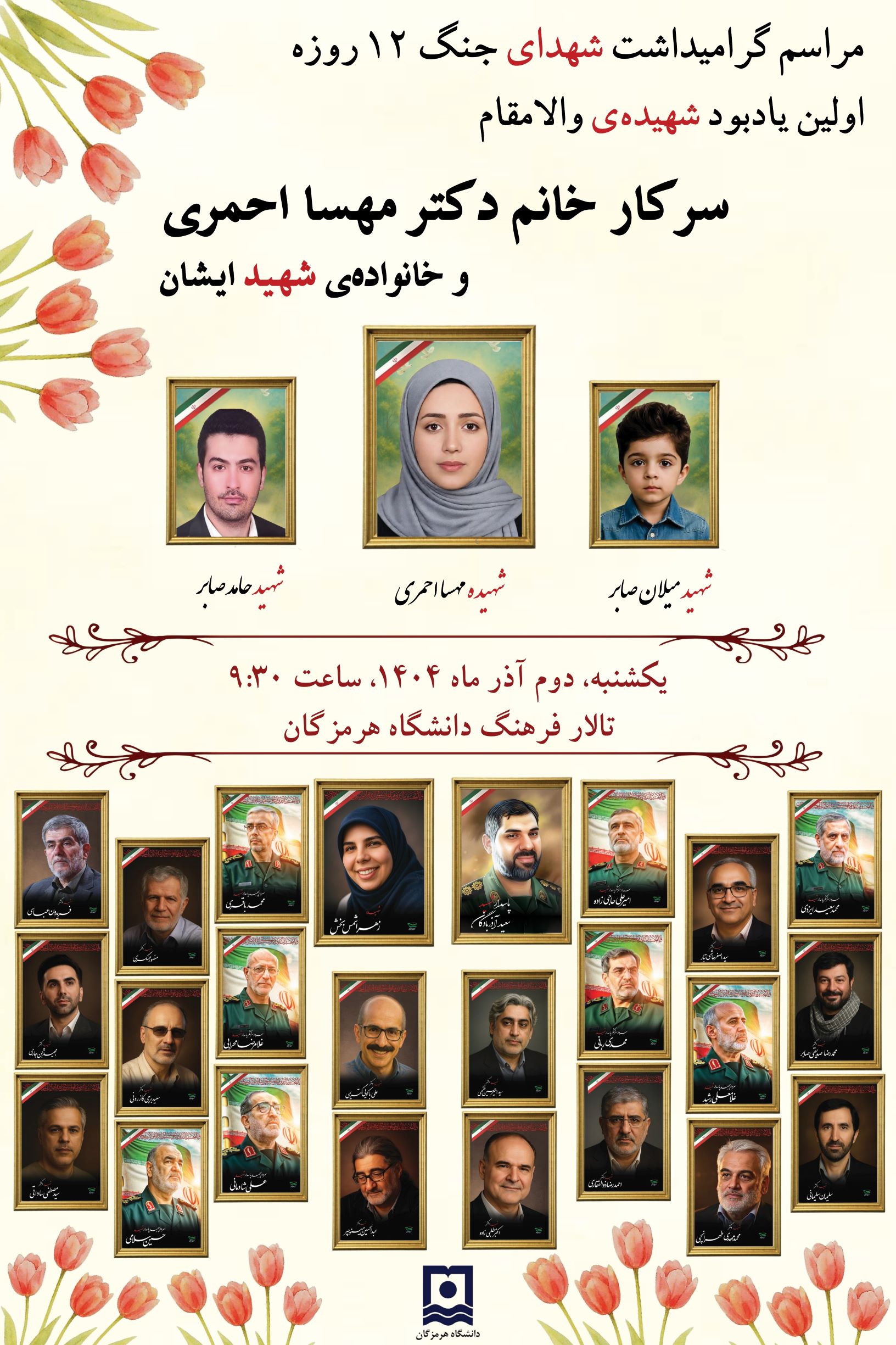 دعوت به حضور در آیین گرامیداشت شهدای جنگ ۱۲ روزه و اولین یادبود شهیده دکتر مهسا احمری در دانشگاه هرمزگان