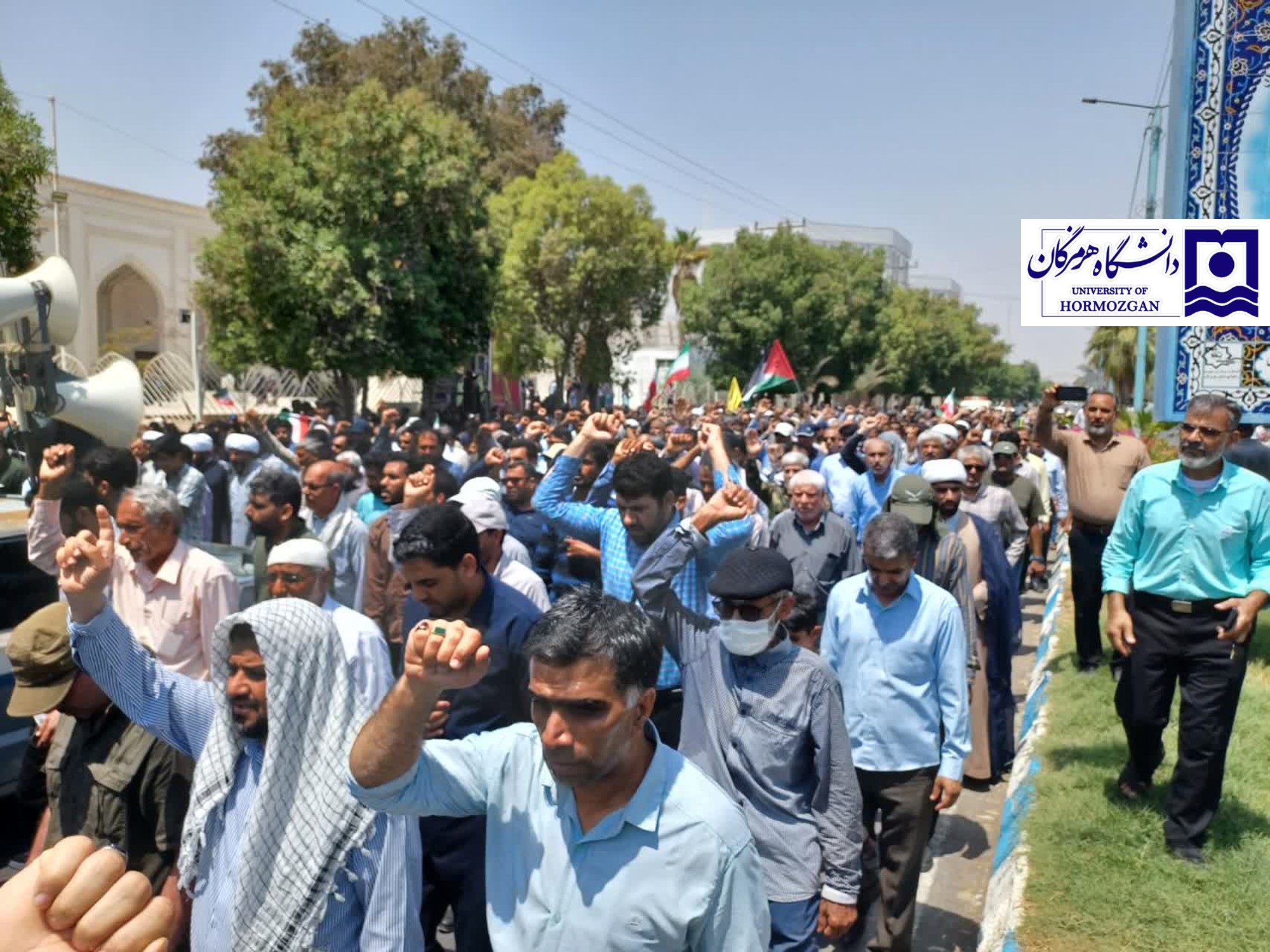 معاونت فرهنگی و اجتماعی دانشگاه هرمزگان در واکنش به این رخداد خونین، طی فراخوانی از خانواده بزرگ دانشگاه، شامل دانشجویان، اساتید و کارکنان، جهت حضور گسترده در راهپیمایی «جمعه خشم و نصر» دعوت به عمل آورد. این مراسم در روز جمعه ۳۰ خرداد در شهر بندرعباس و در گرمای طاقتفرسای جنوبی برگزار شد؛ اما این شرایط دشوار، مانعی برای خروش پرصلابت دانشگاهیان و مردم غیور بندرعباس نبود.