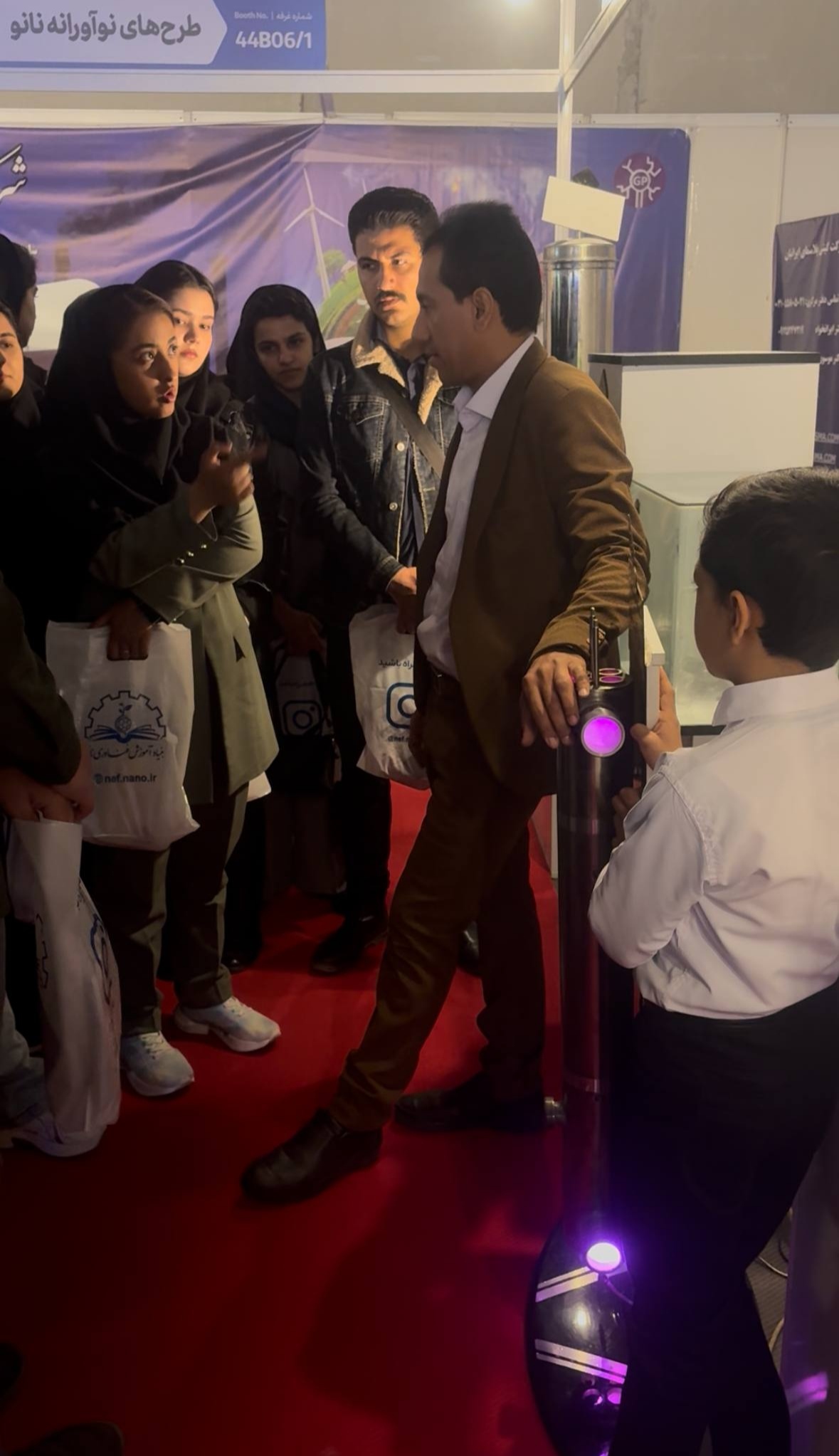 در بخش دیگری از بازدید، آقای جابر سادگی—مدرس نمایشگاه، رابط نهاد ترویجی نانو در هرمزگان، دارنده مدال طلای مسابقات ملی فناوری نانو و فارغالتحصیل دانشگاه هرمزگان—بهعنوان راهنمای علمی همراه گروه بود و با معرفی تخصصی غرفهها، مسیرهای نوآوری و کاربردهای صنعتی فناوری نانو را برای دانشجویان تشریح کرد.