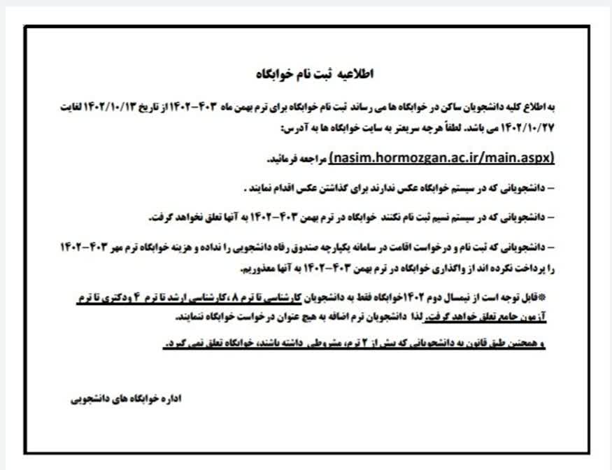 شروع ثبت نام خوابگاه ترم بهمن ماه 1402