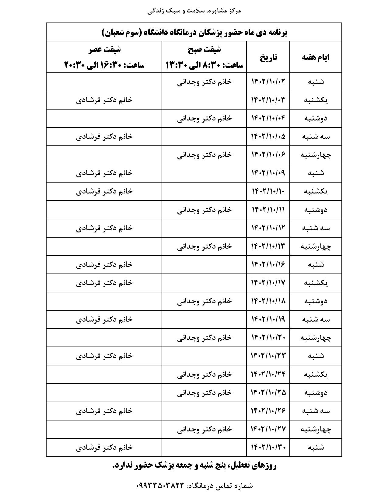 برنامه حضور پزشکان درمانگاه (سوم شعبان) در دی ماه