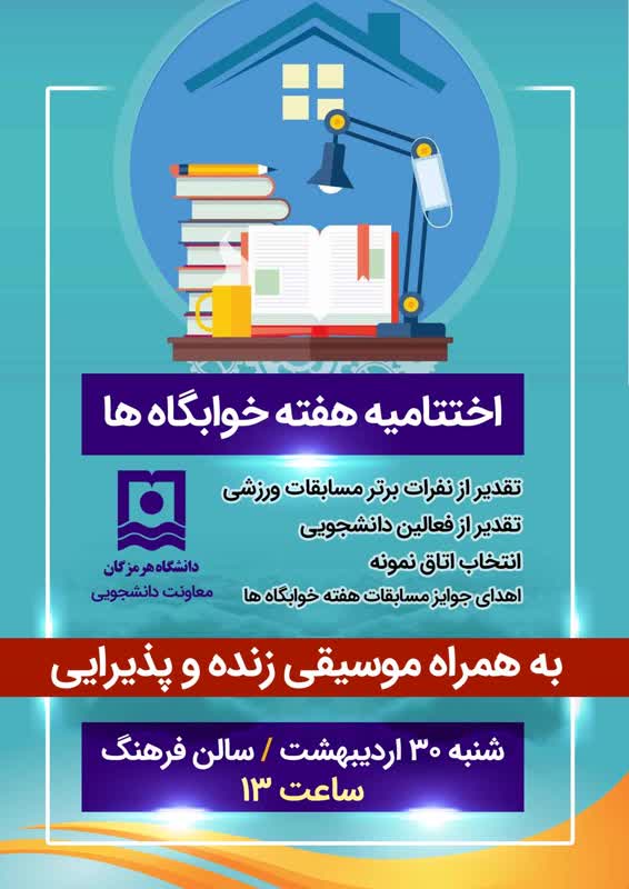 برگزاری مراسم اختتامیه هفته خوابگاه‌ها به همت معاونت دانشجویی دانشگاه هرمزگان و با شعار (خوابگاه دانشـجویی؛ عرصه مسئولیت پذیری و مشارکت جمعی)