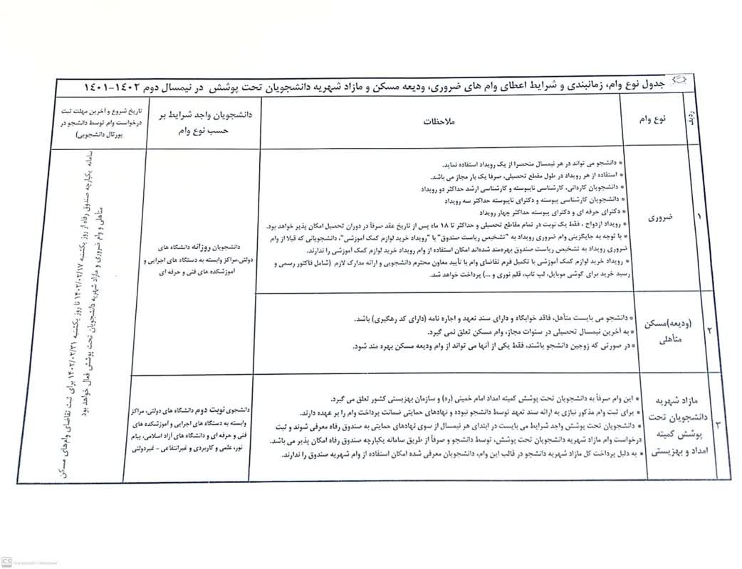جدول نوع وام، زمانبندی و شرایط اعطای وام های دانشجویان تحت پوشش