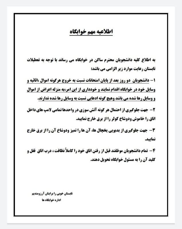 قابل توجه کلیه دانشجویان ساکن در خوابگاه ها