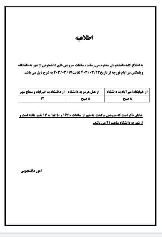 برنامه ساعات حرکت سرویس های دانشجویی در ایام فرجه