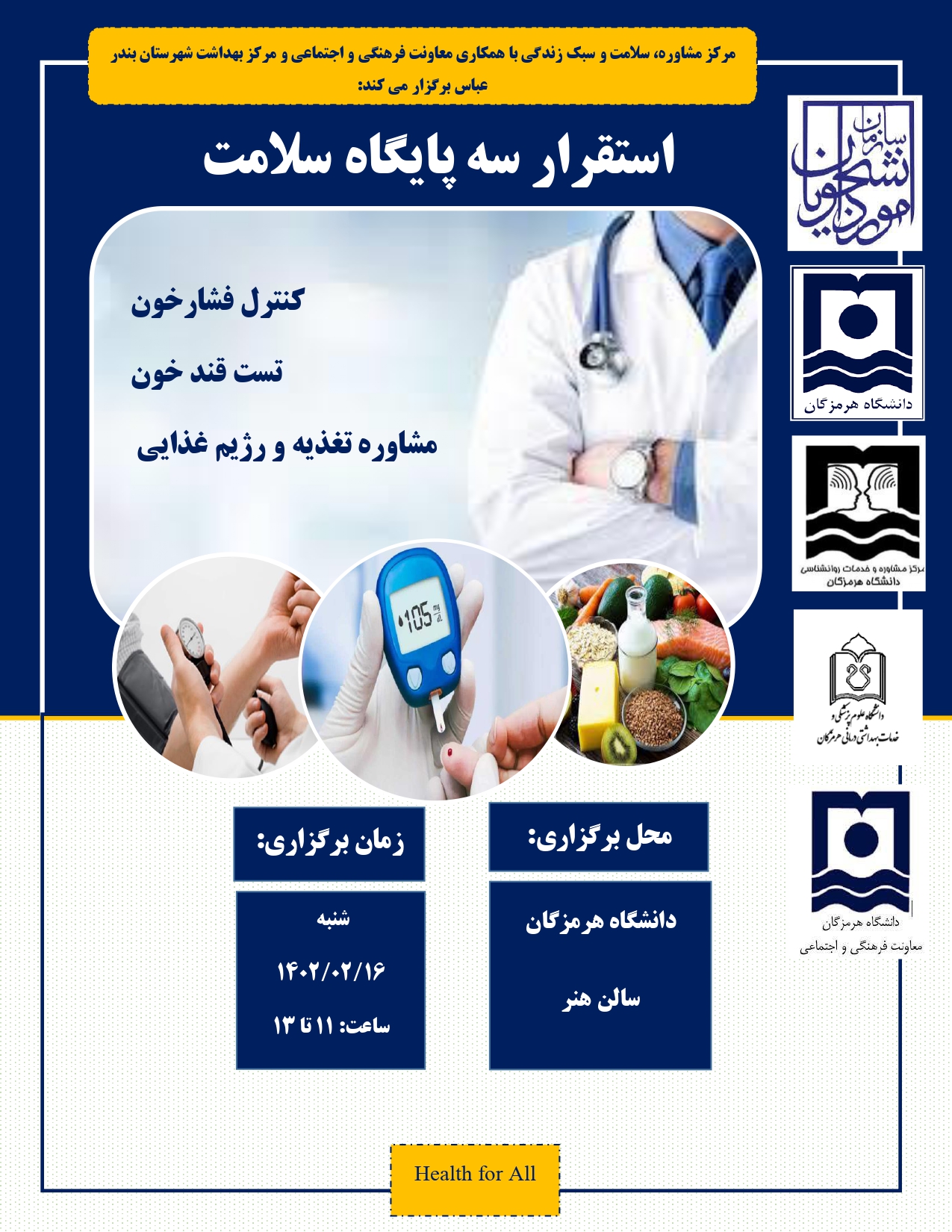 مرکز مشاوره، سلامت و سبک زندگی با همکاری معاونت فرهنگی و اجتماعی و مرکز بهداشت شهرستان بندرعباس برگزار می کند.