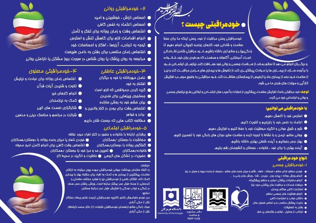 نخستین همایش خود مراقبتی دانشگاه هرمزگان زمان چهارشنبه 21 اردیبهشت ماه مکان سالن فرهنگ ساعت 9:30