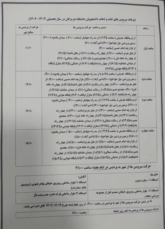 ساعات حرکت سرویس های ایاب و ذهاب دانشجویی در سال تحصیلی 1402-1403
