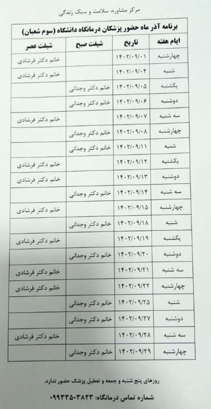 برنامه حضور پزشکان درمانگاه (سوم شعبان) در ماه آذر