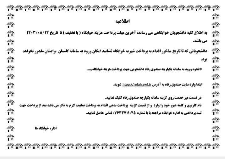 اطلاعیه پرداخت هزینه خوابگاه